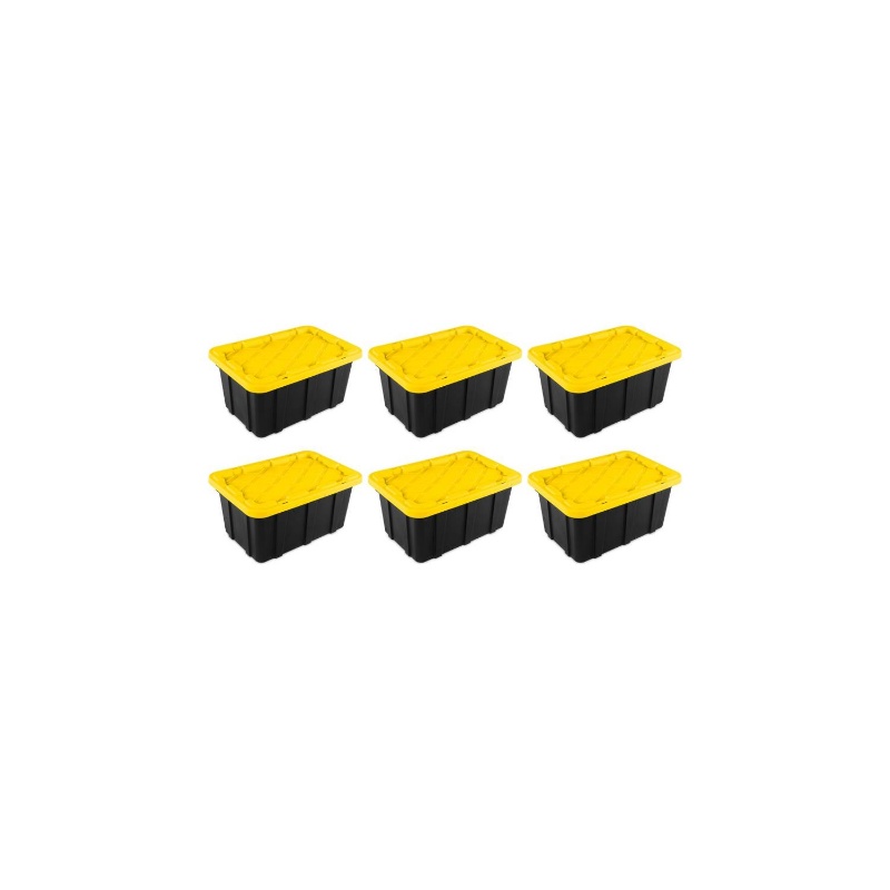 17 Gal Industrial Tote, Stackable Storage Bin with Snap – Fit Lid Garage, Basement Attic Storage, Black Base and Yellow Lily Lid, 6 – Pack