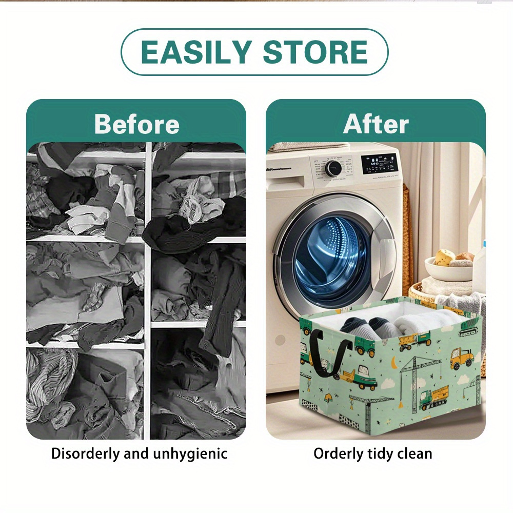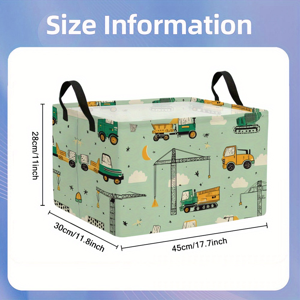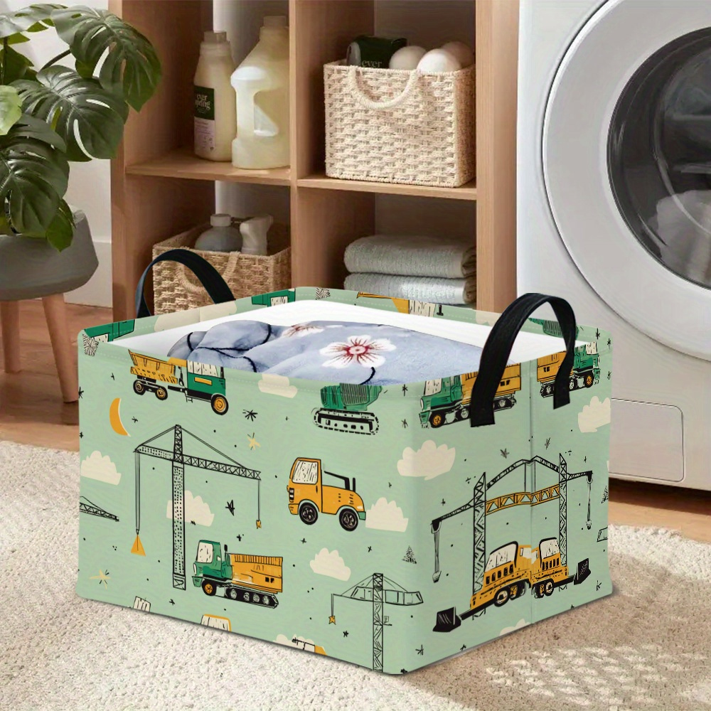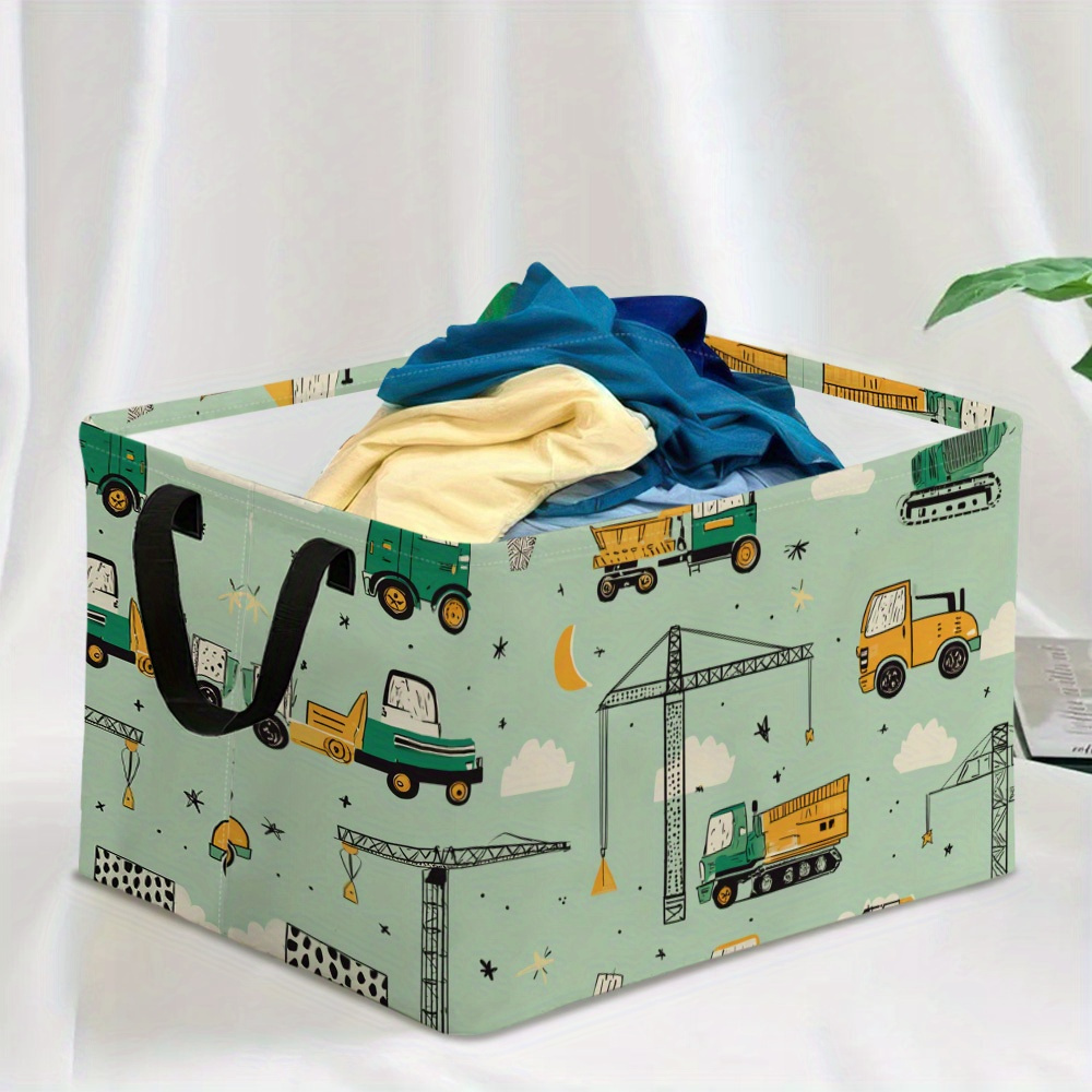 1pc Construction Vehicles & Cranes Collapsible Storage Bin – Heavy Print (Trucks, Excavators, Dump Trucks) with Black Top, Durable Organizer for Room,, Playroom, Outdoor Play, Shelf Baskets
