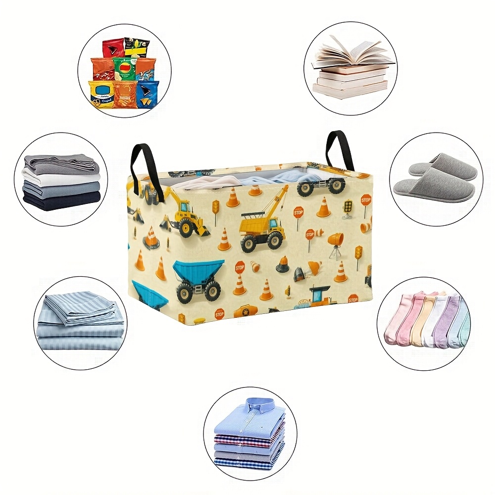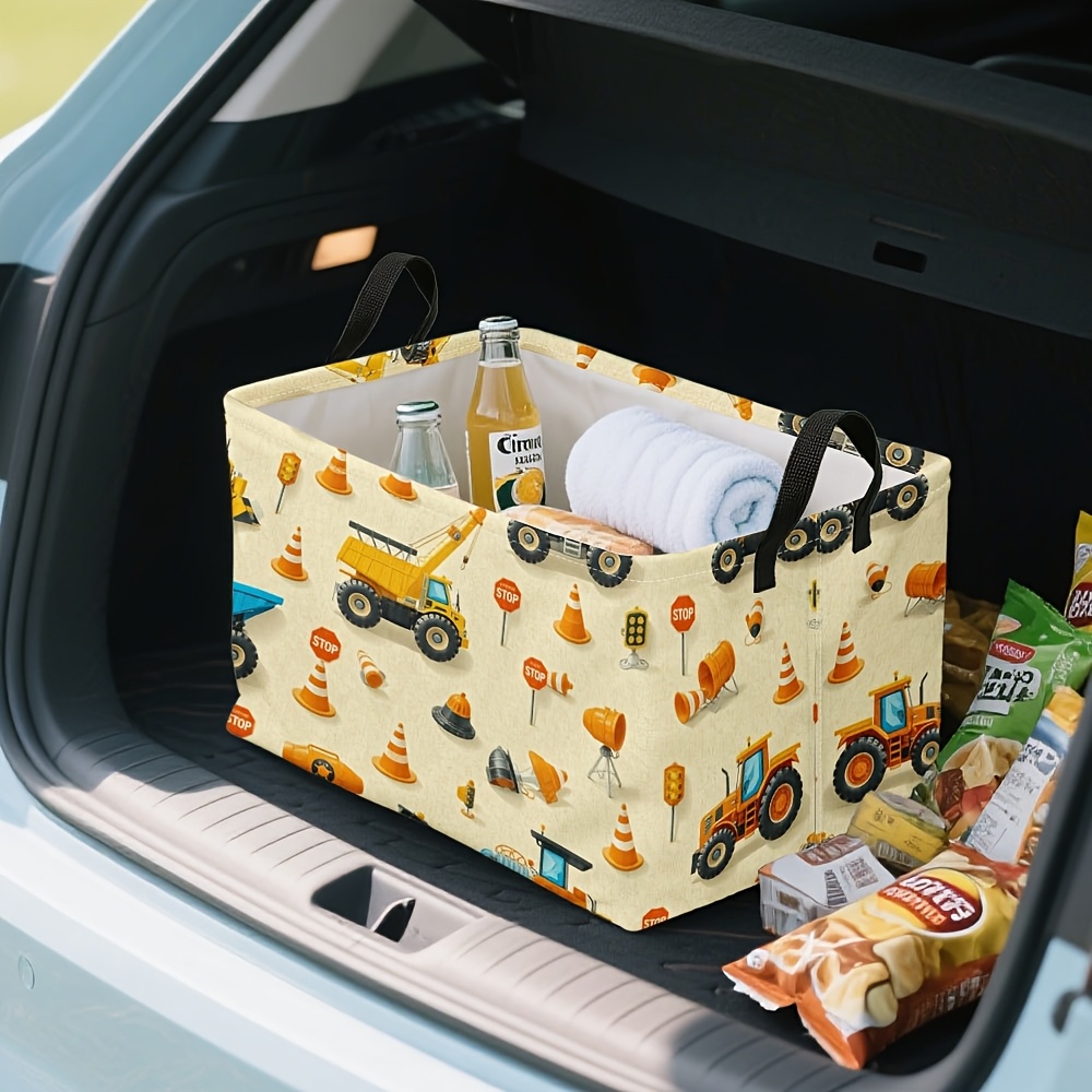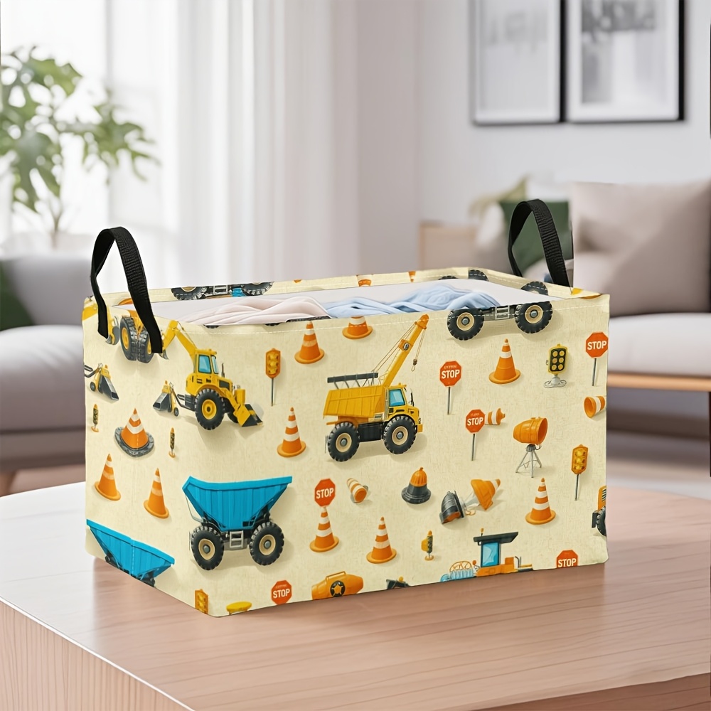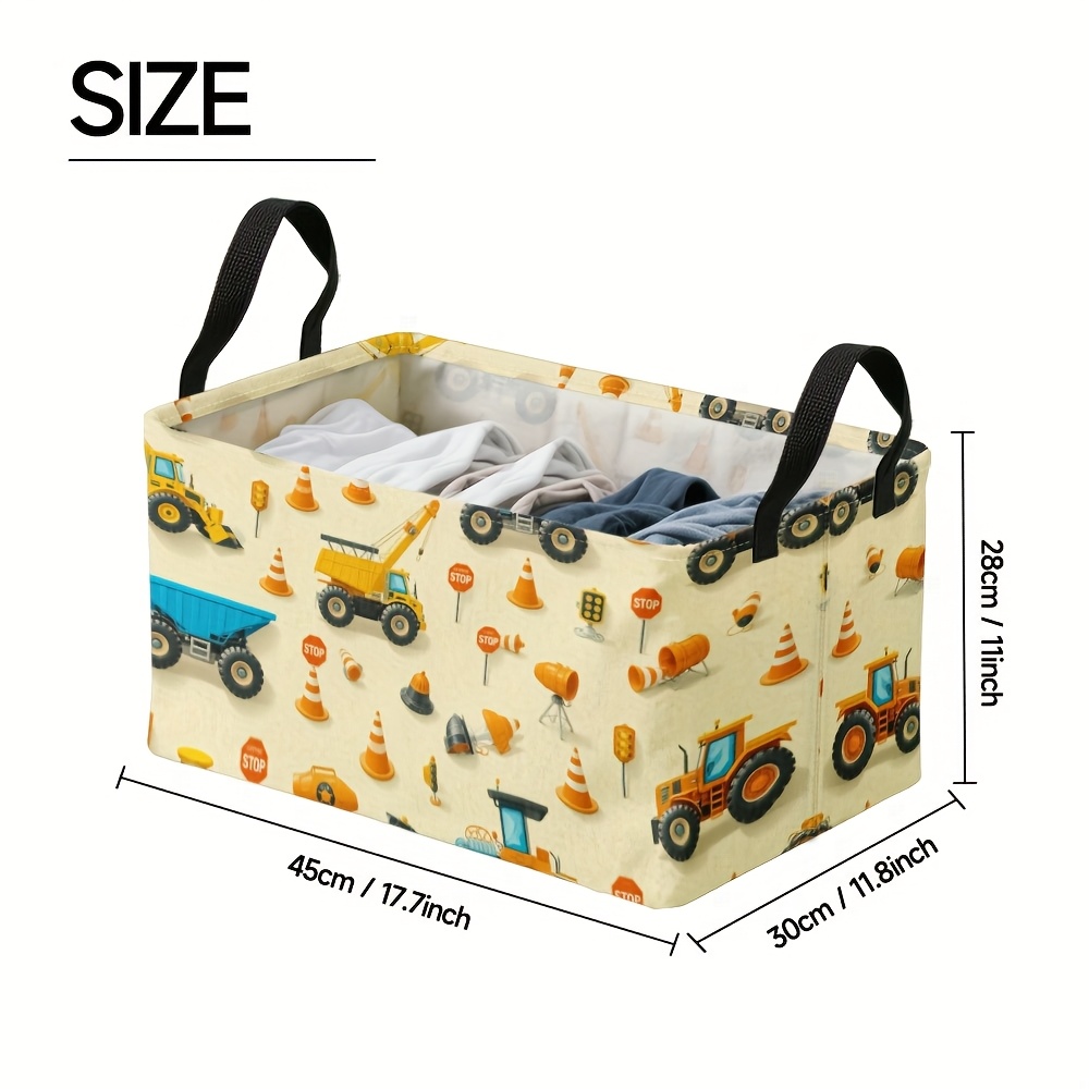 1pc Oversized Foldable Square Storage Bin with Construction Vehicles Print & Sturdy Metal Frame – Heavy-Duty Oxford Fabric-like Organizer for ‘, Craft Room, Laundry Basket, Storage – Collapsible Large Bin