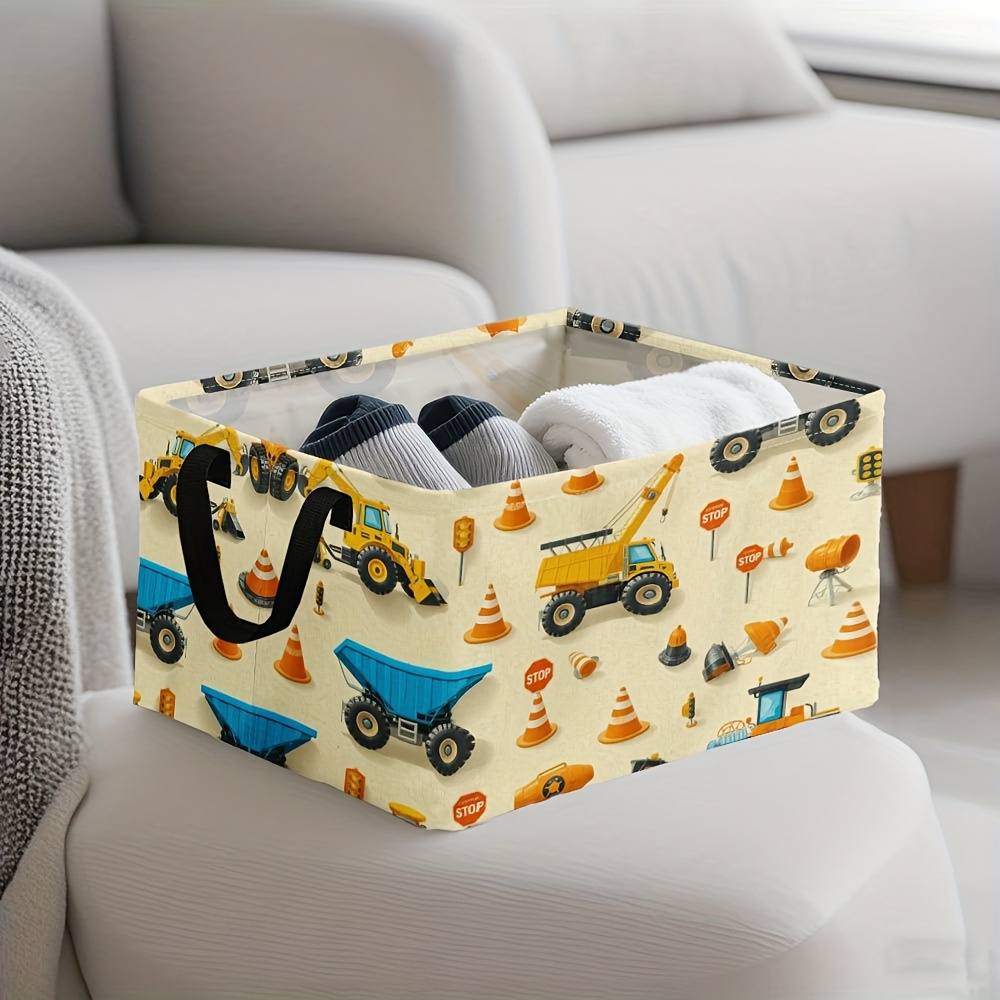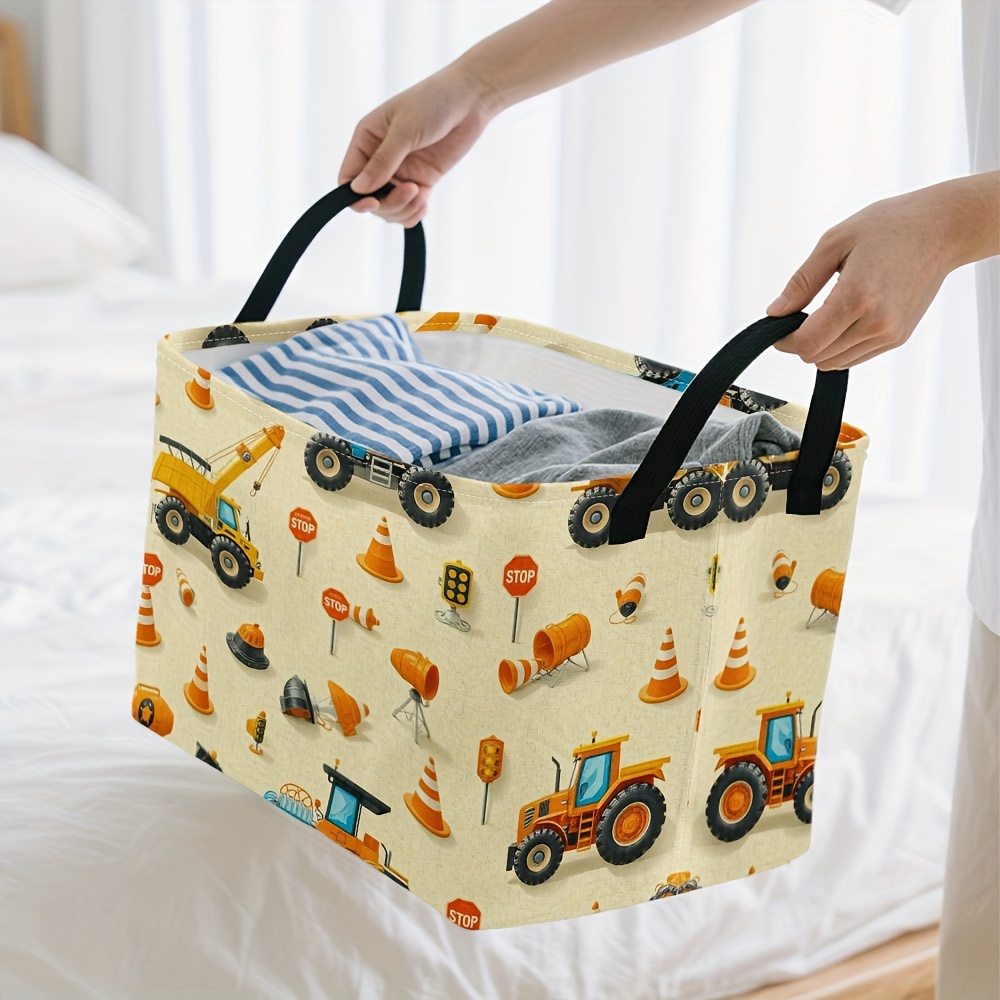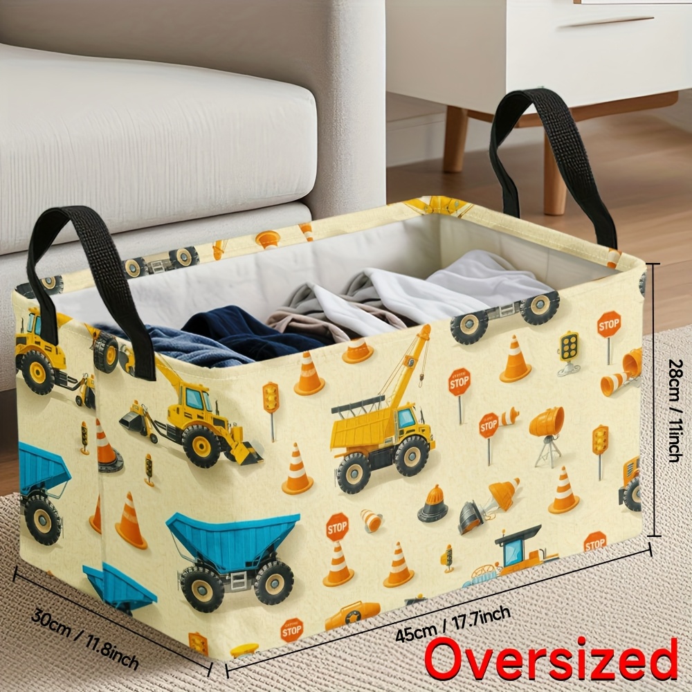1pc Oversized Foldable Square Storage Bin with Construction Vehicles Print & Sturdy Metal Frame – Heavy-Duty Oxford Fabric-like Organizer for ‘, Craft Room, Laundry Basket, Storage – Collapsible Large Bin