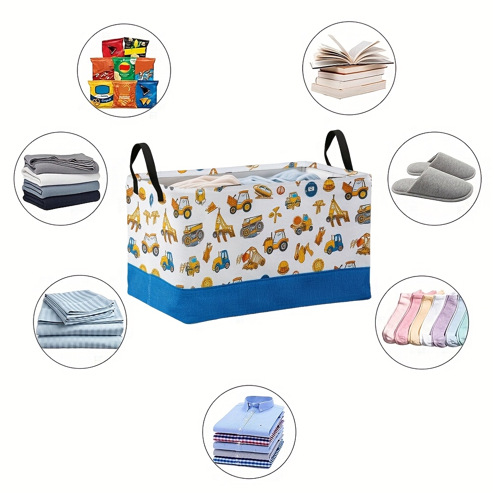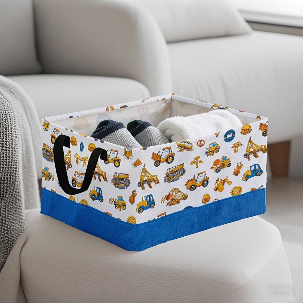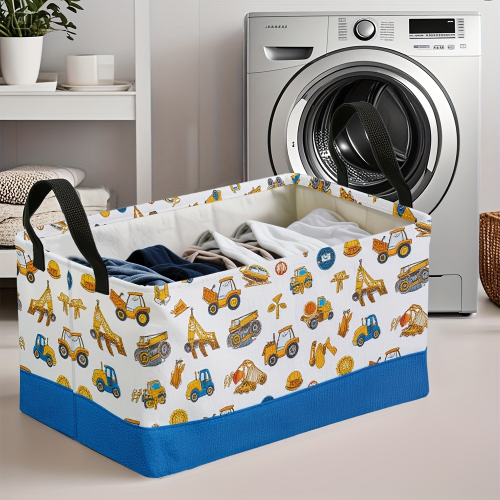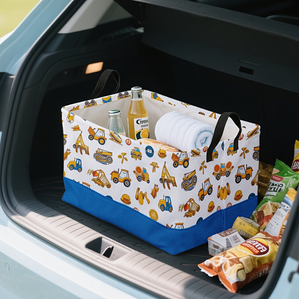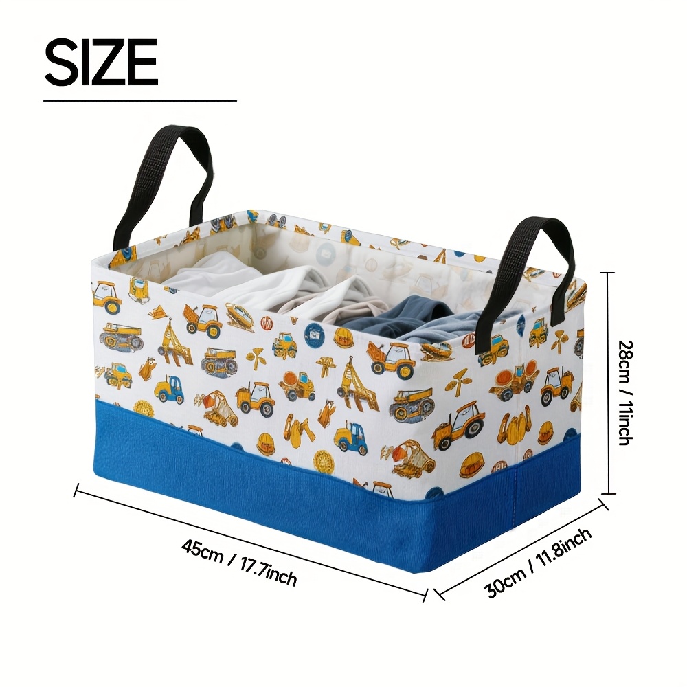 1pc Oversized Foldable Storage Bin with Cartoon Construction Vehicle Print – Durable Polyester, Metal Frame, Ideal for Toys, Clothes, and Office Supplies, 28cm x 45cm x 11.8inch, White with Blue Base, Perfect for Home Organization, Toy Storage Bin | Playful Design | Sturdy Handle, Toy Storage Organizer