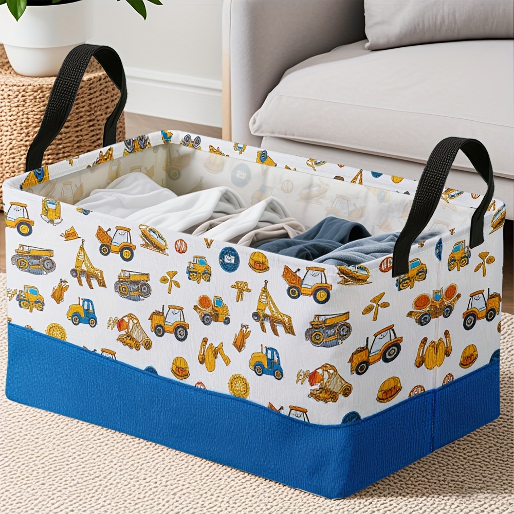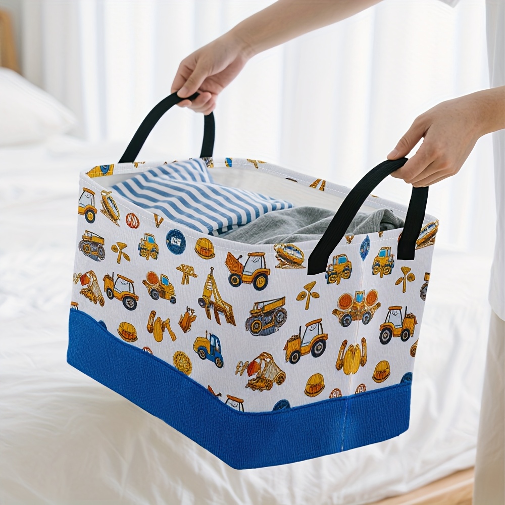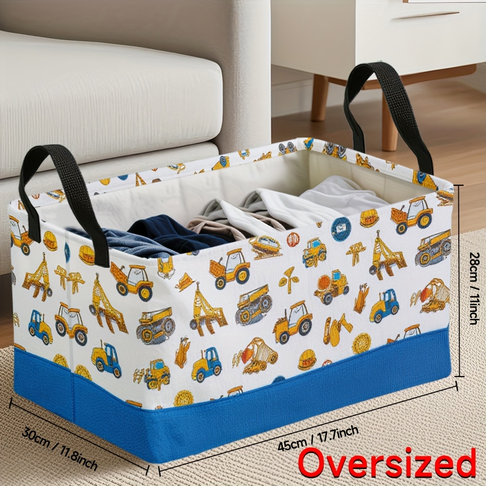 1pc Oversized Foldable Storage Bin with Cartoon Construction Vehicle Print – Durable Polyester, Metal Frame, Ideal for Toys, Clothes, and Office Supplies, 28cm x 45cm x 11.8inch, White with Blue Base, Perfect for Home Organization, Toy Storage Bin | Playful Design | Sturdy Handle, Toy Storage Organizer