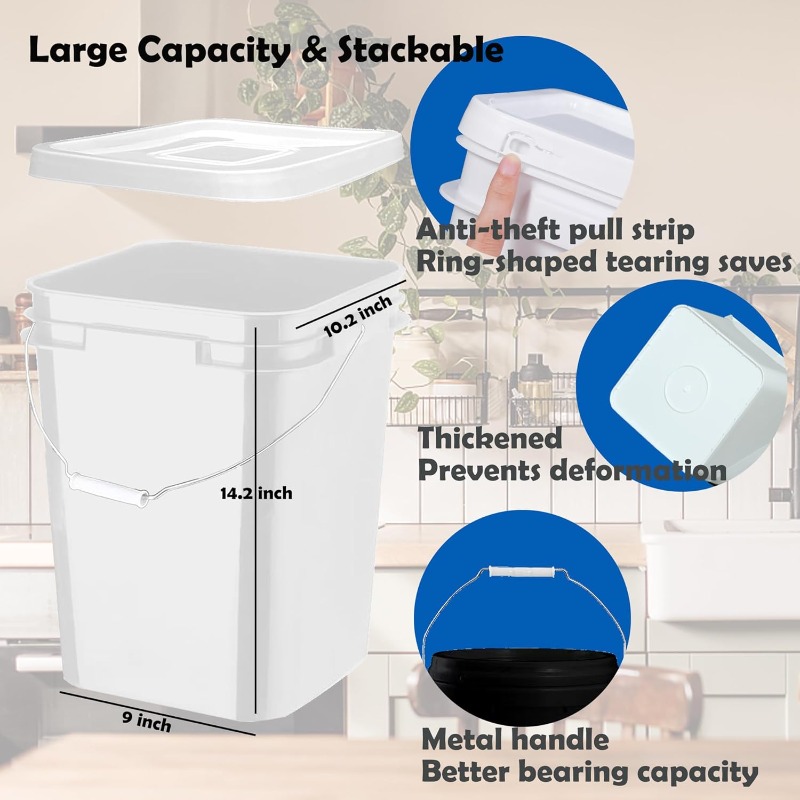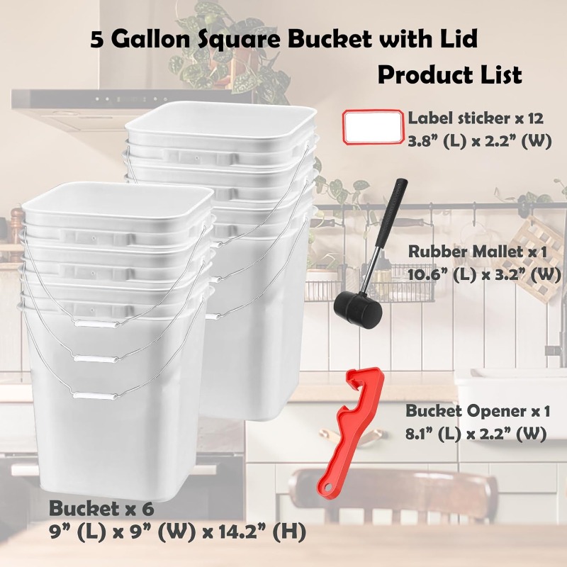 5 Gallon Bucket with Lid Square Food Grade Plastic Pail with Metal Handles Heavy Duty Industrial Storage Containers with DIY Stickers Rubber Mallet Lid Opener 6 Pack White